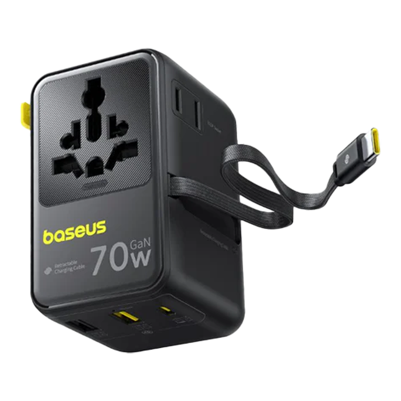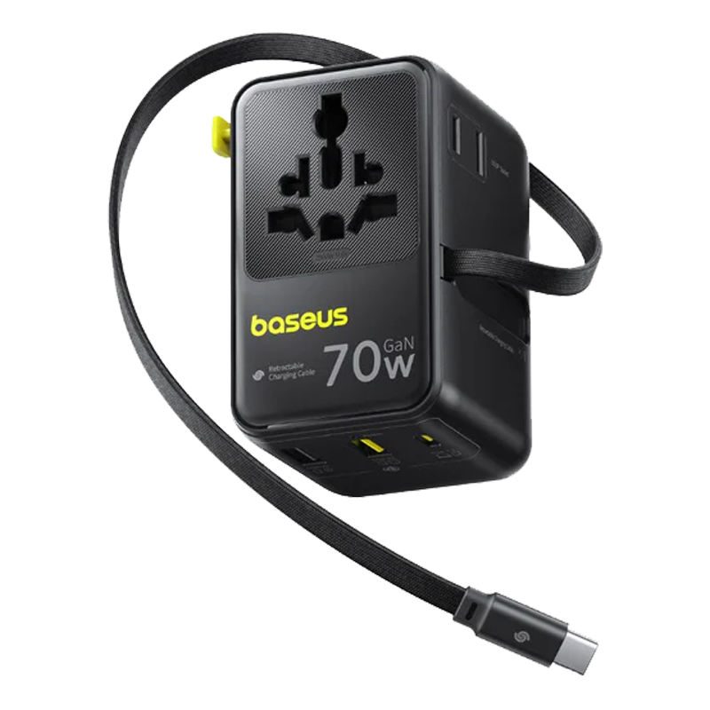 The Baseus EnerCore CG11 is a 6-in-1 GaN-powered travel adapter designed for global use. Its standout feature is the built-in 70W retractable USB-C cable, which eliminates the need for carrying extra wires for your laptop or phone.