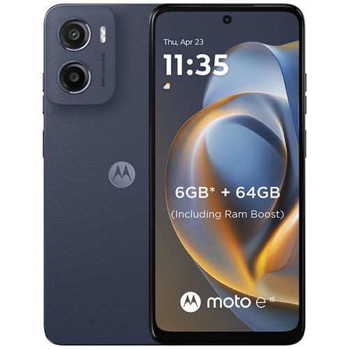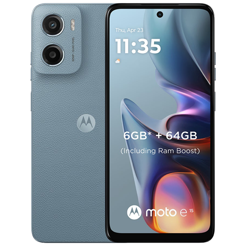 The Motorola Moto E15 with model is a budget-friendly smartphone featuring a 6.67-inch HD+ display, a MediaTek Helio G81 Extreme processor, 2GB of RAM, and 64GB of storage.It runs on Android 14 (Go edition) and includes a 32MP rear camera and an 8MP front camera.The device also boasts a 5200 mAh battery, a side-mounted fingerprint sensor, and an IP54 water-repellent design